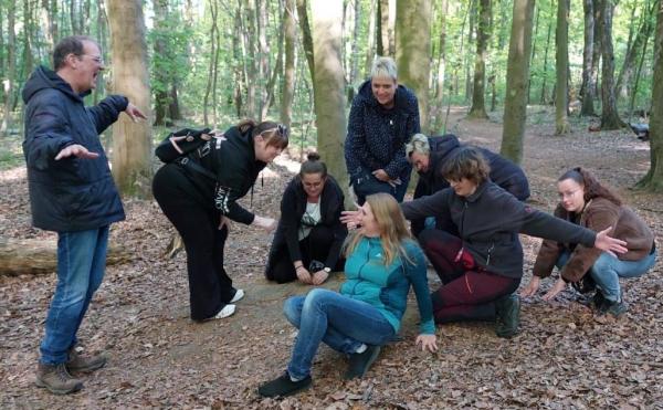 Viel Spaß hatten die Teilnehmerinnen und Teilnehmer bei der Fortbildung "Theater im Wald". Was zunächst vielleicht etwas exotisch anmutet, stellte sich als wunderbare Methode heraus, sich mit Waldthemen anzufreunden. Dabei ist der Zugang über die eigene Erfahrungs- und Vorstellungswelt elementar und kann gerade mit Kindern vertieft werden.